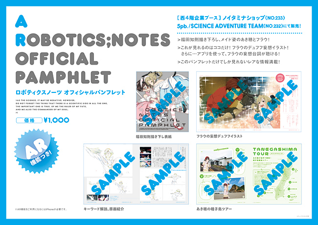 『ロボティクス・ノーツ』のオフィシャルパンフレットが、コミックマーケット83の西4階企業ブースのノイタミナショップ(ブース番号:233)と5pb./SCIENCE ADVENTURE TEAM(ブース番号:232)にて販売いたします。