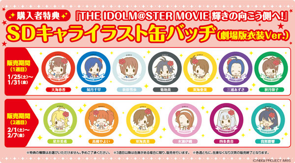 『THE IDOLM@STER MOVIE 輝きの向こう側へ!』の為に書き下ろされた、劇場版衣装Ver.のSDキャライラストを使用した、オリジナル缶バッヂ(全13種)となります。