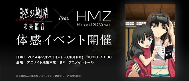 劇場版 空の境界 / 劇場版「空の境界」未来福音feat.HMZ 体感イベント開催 2月 13, 2014 現在、ソニーのヘッドマウントディスプレイとコラボキャンペーンを実施中です。2月25日(火)からの体感イベントでは、会場にて劇場版「空の境界」のグッズを2,000円(税込)以上お買い上げいただいた方に、 描き下ろしオリジナルイラストを使ったクリアファイルをプレゼント致します。詳細はコチラ■作品詳細ページ 共有 リンクを取得 Facebook × Pinterest メール 他のアプリ ラベル Aniplex karanokyoukai アニプレックス 劇場版 空の境界 共有 リンクを取得 Facebook × Pinterest メール 他のアプリ コメント