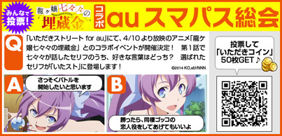 auスマートパスで配信中の人気ゲーム「いただきストリートfor au~つながるボード大陸!~」とのコラボレーション企画が進行中! ゲームに登場する龍ヶ嬢七々々のセリフを選ぶユーザー投票をauスマパス総会で受け付け中です。お答えいただいた方にゲーム内で使える「いただきコイン50枚」をプレゼント!
