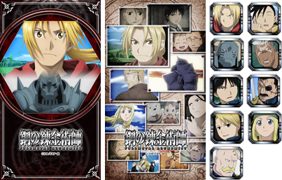エド・アル待受と場面カットをコラージュした待受を2枚、アイコンにはエド・アルをはじめロイ・アームストロング、ウィンリィなどお馴染みのキャラクターたちが9つ入っています。