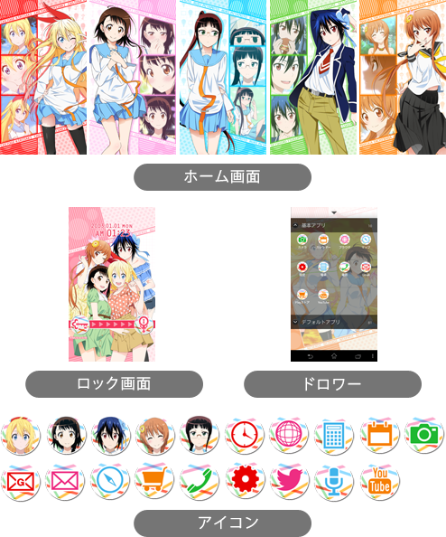 ホーム画面、ロック画面、ドロワー画面、アプリアイコンが一気に「ニセコイ」バージョンに変身!