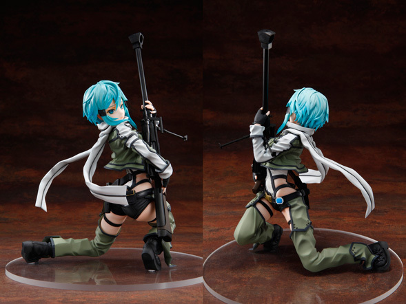 リアルな質感を追求した衣装や憂いを帯びた表情など、細かい部分まで繊細に造形。また、デジタル造形によってシノンの愛銃ヘカートⅡも細部まで再現しているなど、見どころ満載のフィギュアです!