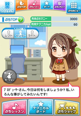 ちっちゃなアイドル「ぷちデレラ」を「ぷちレッスン」や「テクニカルボード」で育成したり、