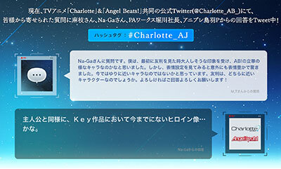 Charlotte / 「Charlotte」&「Angel Beats!」Q&A公開 3月 28, 2015 3月21日と22日に開催されたアニメジャパンにて公開されていました、皆様からの質問とスタッフ(麻枝・Na-Ga・堀川・鳥羽)からの回答をサイト上にまとめました。詳細はこちら■作品詳細ページ 共有 リンクを取得 Facebook × Pinterest メール 他のアプリ ラベル Aniplex charlotte アニプレックス 共有 リンクを取得 Facebook × Pinterest メール 他のアプリ コメント