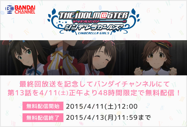 『アイドルマスター シンデレラガールズ』1stシーズン、最終回放送を記念してバンダイチャンネルにて、最終回の第13話を土曜正午より48時間限定で無料配信を行います。