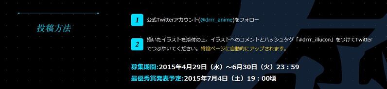 デュラララ!!×2 / 『「デュラララ!!×2 承」イラストコンテスト~芸術は長く人生は短し~』開催! 4月 29, 2015 本日より『「デュラララ!!×2 承」イラストコンテスト~芸術は長く人生は短し~』開催致します!「デュラララ!!」としては5年ぶりのイラストコンテスト!指定のテーマはございませんので、皆様の自由な投稿をお待ちしております!優秀賞に選ばれた方にはプレゼントも! 詳しくはコチラ ■作品詳細ページ 共有 リンクを取得 Facebook × Pinterest メール 他のアプリ ラベル Aniplex durararax2 アニプレックス デュラララ!!×2 共有 リンクを取得 Facebook × Pinterest メール 他のアプリ コメント