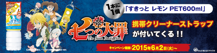 「すきっと レモンPET600ml」を1本買うと、「七つの大罪 携帯クリーナーストラップ」が1個ついてきます!