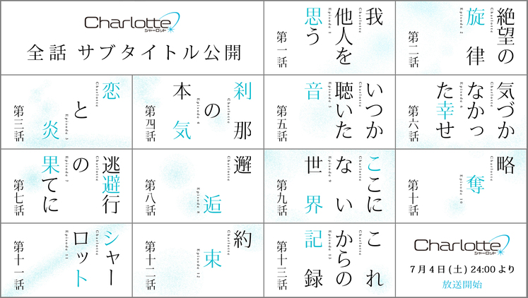 Charlotte / 全話サブタイトル公開 7月 04, 2015 7月4日放送開始、「Charlotte(シャーロット)」。本作全話のサブタイトルを公開いたしました。 最後まで、本作をお楽しみいただけますと幸いです。 ■作品詳細ページ 共有 リンクを取得 Facebook × Pinterest メール 他のアプリ ラベル Aniplex charlotte アニプレックス 共有 リンクを取得 Facebook × Pinterest メール 他のアプリ コメント