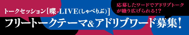 AD-LIVE Project / AD-LIVE トークセッション[喋-LIVE(しゃべりぶ)]フリートークテーマ&アドリブワード募集! 5月 11, 2016 5月22日(日)、5月29日(日)に開催される「AD-LIVE トークセッション[喋-LIVE(しゃべりぶ)]」の中で出演キャストがフリートークで"喋”るトークテーマと、イベント内で使用するアドリブワードを来場者の皆様から募集します。皆さんのワードが奇跡を生むかも!?奮ってご応募ください。※トークテーマ、アドリブワードともにお一人最大2つまでご応募いただけます。応募はコチラ■作品詳細ページ 共有 リンクを取得 Facebook × Pinterest メール 他のアプリ ラベル ad-live AD-LIVE Project Aniplex アニプレックス 共有 リンクを取得 Facebook × Pinterest メール 他のアプリ コメント