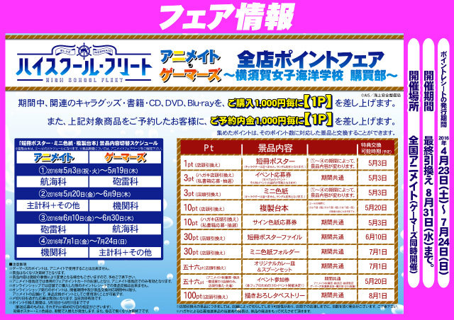 ハイスクール・フリート / アニメイト・ゲーマーズ全店で 『~横須賀女子海洋学校 購買部~』開催中! 5月 13, 2016 アニメイト・ゲーマーズ全店ポイントフェア 『~横須賀女子海洋学校 購買部~』が開催中です!ポイント数に応じてさまざまな景品をご用意しておりますのでぜひゲットしてくださいね。(短冊ポスター・ミニ色紙・複製台本は期間、店舗によってもらえるキャラクター絵柄が異なるのでご注意ください。) 詳細はコチラからどうぞ! >>アニメイト>>ゲーマーズ ■作品詳細ページ 共有 リンクを取得 Facebook × Pinterest メール 他のアプリ ラベル Aniplex hai-fri アニプレックス ハイスクール・フリート 共有 リンクを取得 Facebook × Pinterest メール 他のアプリ コメント