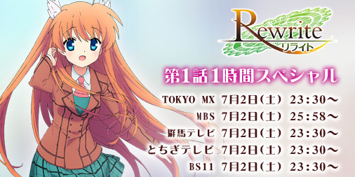 Rewrite / TVアニメ「Rewrite」放送日時詳細情報発表! 6月 18, 2016 TVアニメ「Rewrite」放送日時詳細情報発表! 第1話はなんと1時間スペシャル!下記の放送局・日時で放送予定です。お楽しみに!●TOKYO MX 7月2日 土 23:30~ ●MBS 7月2日 土 25:58~ ●群馬テレビ 7月2日 土 23:30~ ●とちぎテレビ 7月2日 土 23:30~ ●BS11 7月2日 土 23:30~ ※放送開始日・放送日時は編成の都合等により変更となる場合がございます。予めご了承ください。■作品詳細ページ 共有 リンクを取得 Facebook × Pinterest メール 他のアプリ ラベル Aniplex Rewrite アニプレックス 共有 リンクを取得 Facebook × Pinterest メール 他のアプリ コメント