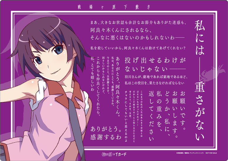 「Tカード(〈物語〉シリーズデザイン)」の特典として、オーディオコメンタリーでも話題になった「戦場ヶ原下敷き」のエントリーは、7月7日まで!抽選で50名様にプレゼント!
