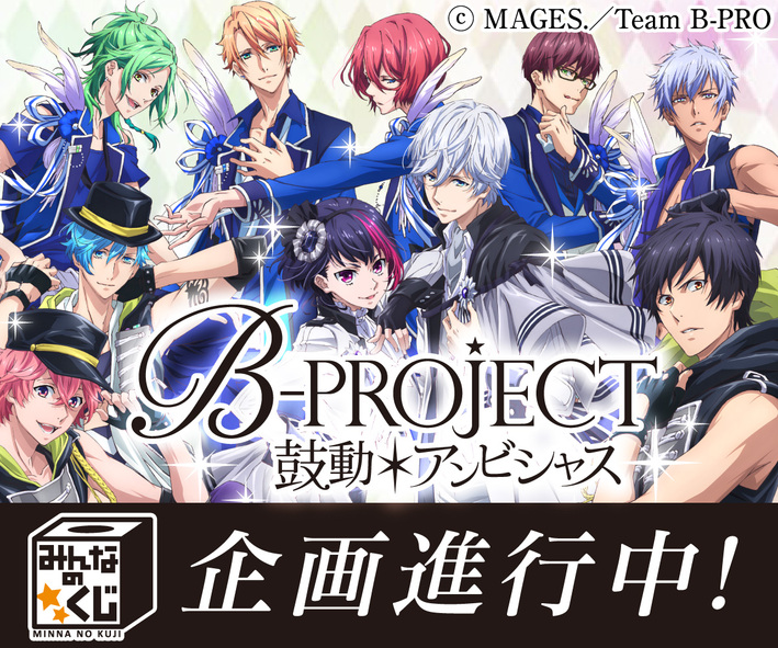 フリューにて「みんなのくじ B-PROJECT~鼓動*アンビシャス~」企画が決定しました!上位賞には描きおろしグッズや録りおろしボイス付ぬいぐるみなどがラインナップ!詳細はTVアニメ公式サイトとみんなのくじ公式サイトにて順次公開♪発売は冬頃を予定していますので、続報をお楽しみに☆