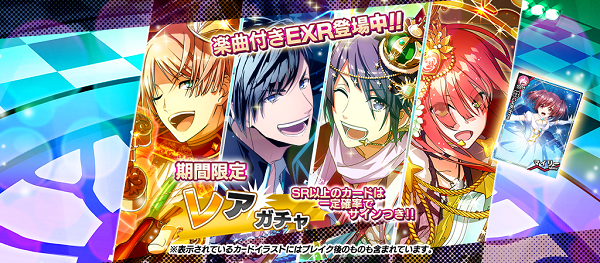 ピックアップ期間中、対象の「EXR:佐伯 翼」「EXR:小金井 進」「EXR:鳳 葵陽」「EXR:シェリー」は出現確率がアップ!