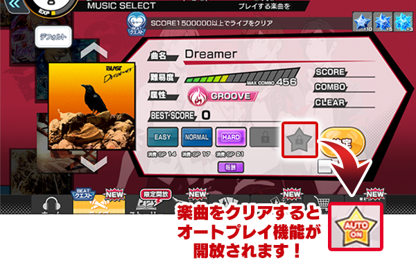 オートプレイを使用したい各楽曲の難易度を1回クリアすることで、オートプレイのON/OFF切り替えが可能になります。